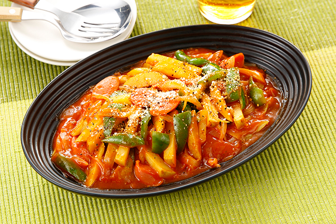 試合観戦のお供に!スタジアムグルメ風「新じゃがとソーセージのナポリタン」